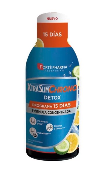 Este complemento alimenticio XtraSlim Chrono Detox del laboratorio Forté Pharma, ayuda a la pérdida de peso, a detoxificar y al drenaje del cuerpo. Su fórmula concentrada con diente de león, clorela, saúco, manganeso y selenio, promueve las funciones de eliminación del organismo y facilita la pérdida de peso. Acompañado de una dieta equilibrada y un estilo de vida saludable, los resultados de este complemento alimenticio pueden ayudar al usuario a alcanzar el peso deseado.\r\n\r\n*Agradable sabor a limón-pepino. Complemento alimenticio con edulcorantes para 15 días.